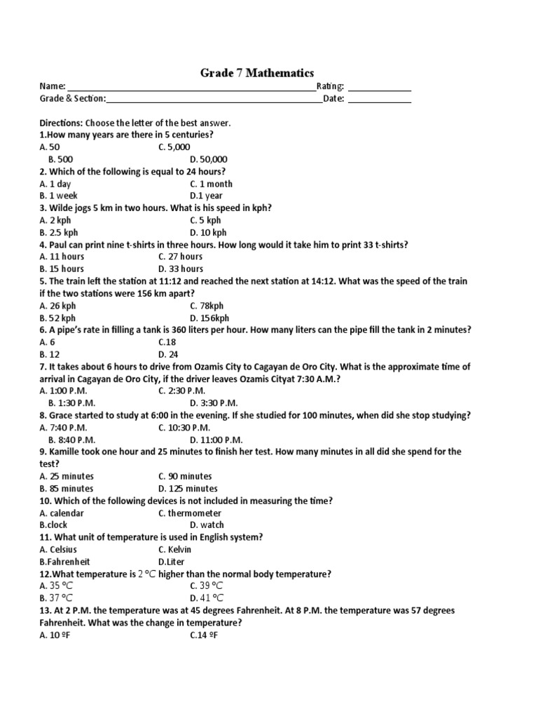 Gr 7 Math Exam Pdf Celsius Fahrenheit